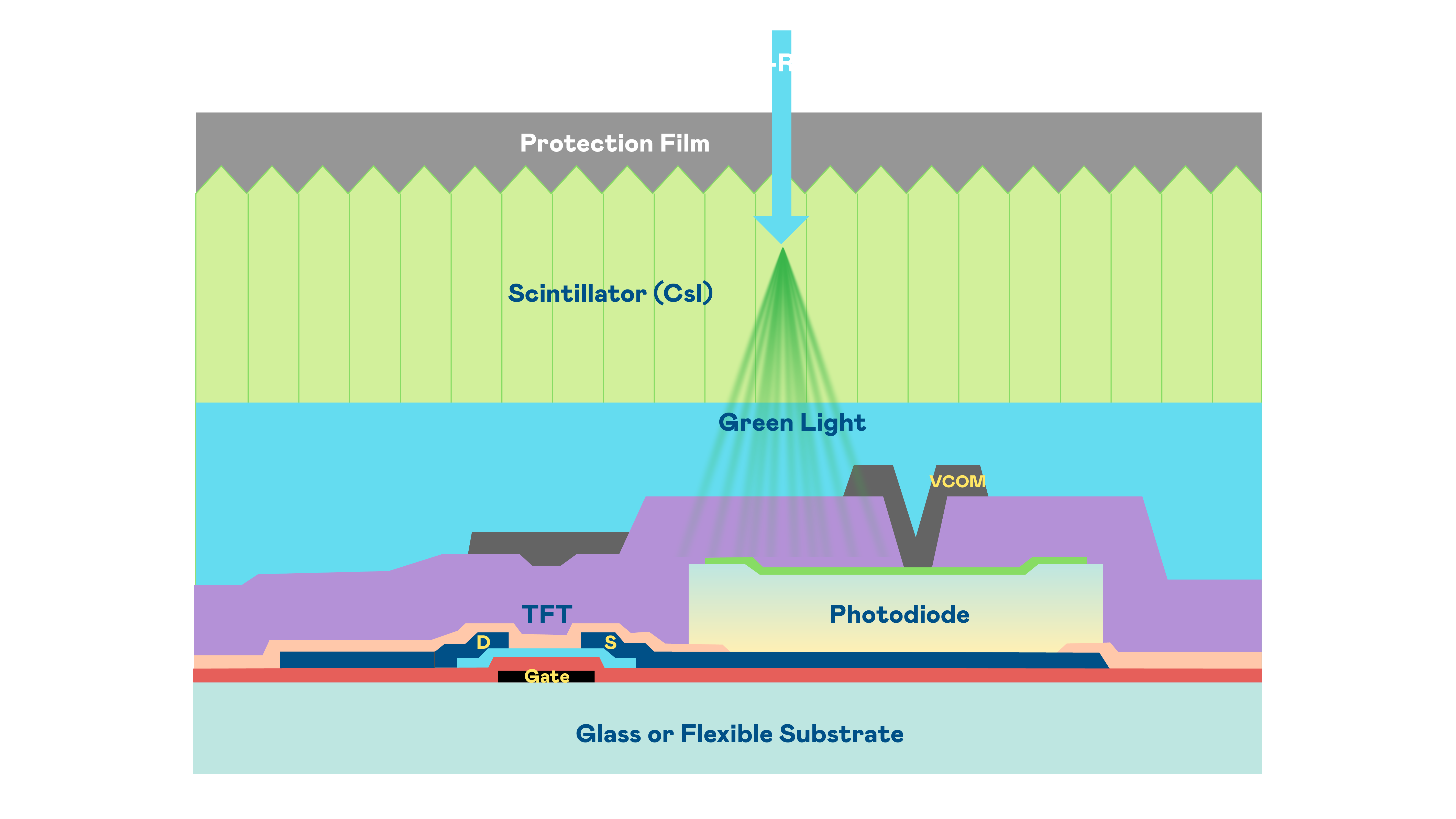 z6尊龙凯时的X光影像感测阵列使用薄膜电晶体 (TFT) 作为每个像素的读取开关,搭配光电二极体(Photodiode)的光电转换元件,用以感测X光影像讯号。